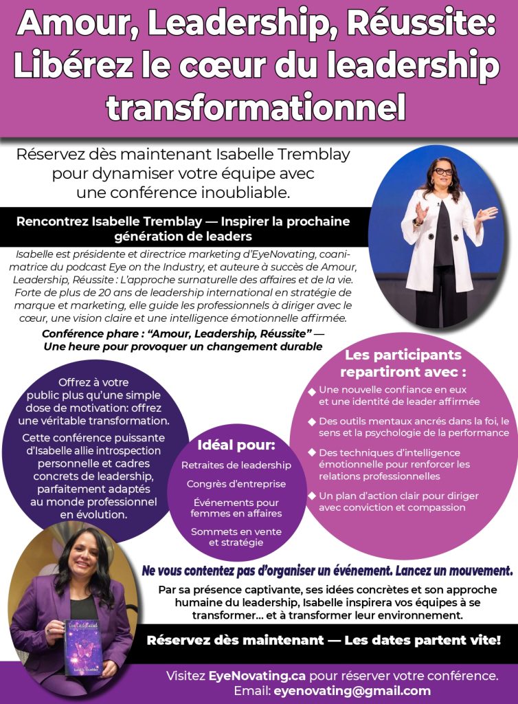Allumons la passion et la créativité au sein de votre équipe avec des séances de motivation qui inspirent, stimulent et responsabilisent. L’auteure à succès de « Love, Lead Success », Isabelle Tremblay apporte des années d’expérience, des idées de pointe et des stratégies pratiques tirées de son livre pour aider votre équipe à surmonter les obstacles, à accepter le changement, à croire en elle-même et à obtenir des résultats extraordinaires.